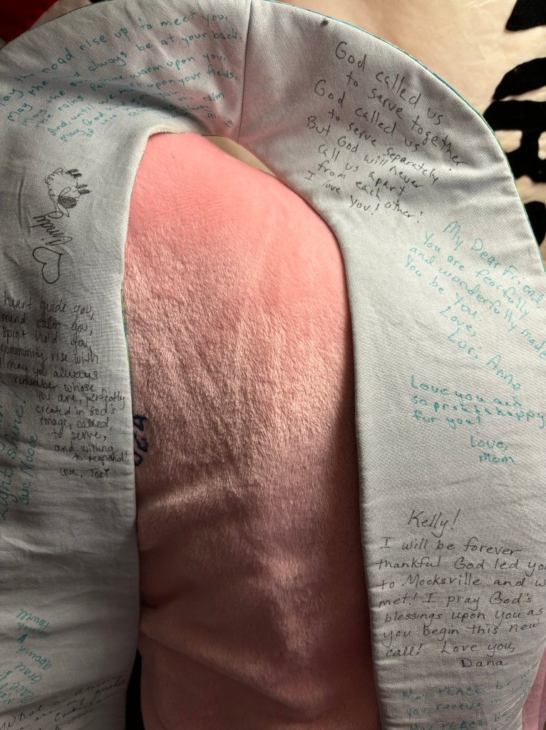 When I accepted the call to Our Saviour’s Lutheran in Welcome, NC I made a liturgical stole for myself. Green because it is the color of the liturgical calendar that we use the most. On the back of my stole are signatures, sayings, blessings from a few of my personal saints. Sadly some of my saints were not able to be in the vacinity to sign it or have passed into the immediate presence of our Lord. I wear this stole frequently and know that these people are cheering me on, holding me up, wrapping their arms around me, and encouraging and shaping my faith. For my saints I say thank you – and those words are not adequate yet the ones that I can think of right now. You are amazing!